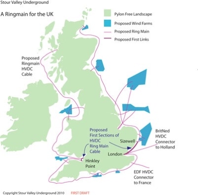 But there are differences in both emphasis and objective between these propositions and it is worth looking at them to see how they can serve our objectives. Our ring main proposal is essentially a way of shifting the burden of UK electricity transmission out of our lovely landscape and placing it near the coastally located generators of the future. The result will be a drastic reduction in the requirement for transmission capacity on land, thereby negating the need for reinforcement of the current on-land grid.