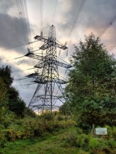 The Twinstead Tee, the pylon that marks one end of the connection project. It is located in a marsh area that was an ancient hopgrounds for the surrounding communities in Henny, near Twinstead, Essex. As the image shows, this pylon is set beside a nature reserve.